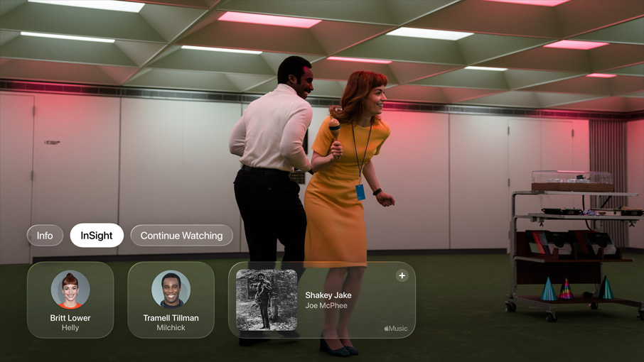 InSight. Du kan få information om serier og film fra Apple Originals, mens du ser dem. Du skal bare bruge betjeningsfunktionerne til medieafspilning, hvis du vil vide mere om skuespillerne på skærmen og den musik, der spilles. Oplysningerne opdateres løbende, mens scenerne skifter. Og hvis du bruger din iPhone som fjernbetjening til Apple TV, får du InSight-oplysninger leveret i hånden.5