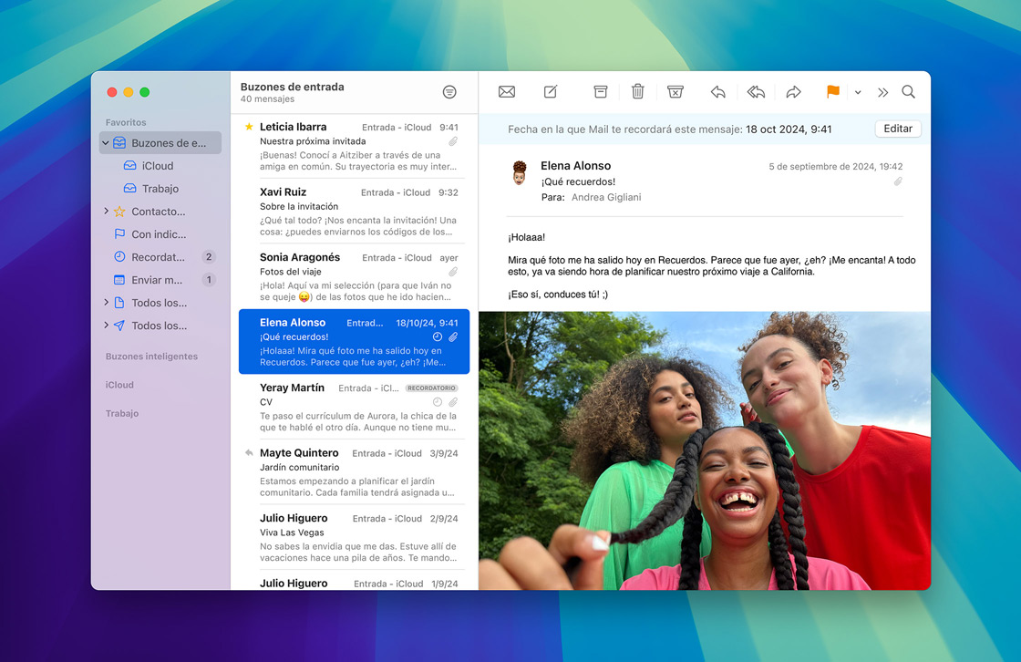 Mail de iCloud está perfectamente integrado con la app Mail del iPhone, iPad o Mac, y con iCloud.com es muy fácil enviar y recibir correos desde cualquier parte. Además, cuentas con prestaciones de seguridad como la protección frente a spam o phishing, que permite detectar y bloquear el correo no deseado incluso antes de que llegue a tu bandeja de entrada. Puedes crear fácilmente tus propias direcciones de email @icloud.com y, si te suscribes a iCloud+, también tendrás la opción de usar un dominio personalizado.