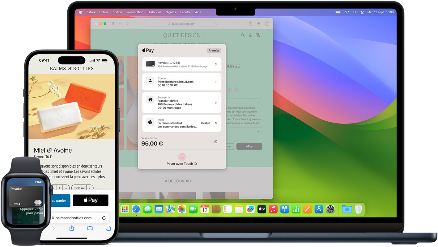 Un paiement Apple Pay est plus sécurisé qu’un paiement effectué à l’aide d’une carte bancaire ou prépayée traditionnelle. Pour toutes les transactions effectuées avec votre iPhone, Apple Watch, Mac ou iPad, vous devez vous authentifier avec Face ID, Touch ID ou votre code d’accès. Votre identité et votre numéro de carte bancaire ne sont jamais communiqués aux commerces ni stockés sur votre appareil ou sur les serveurs Apple.