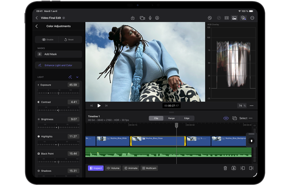 Tournez, montez et partagez vos vidéos depuis un même appareil doté d’un système caméra pro avec scanner LiDAR, de micros de qualité studio et de quatre haut‑parleurs. Filmez en ProRes 4K, enregistrez un podcast et choisissez le micro le plus adapté à chaque app grâce au sélecteur d’entrée.