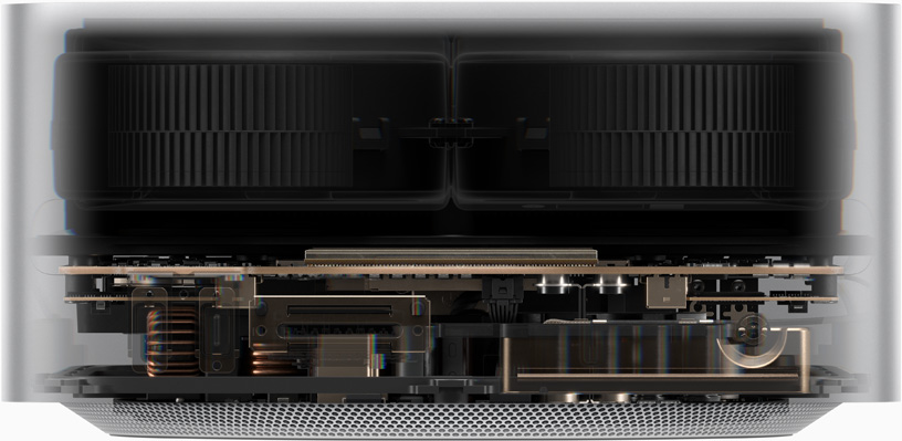 Dans son boîtier carré de 19,7 centimètres de côté, le Mac Studio renferme un système thermique conçu pour permettre à la puce M4 Max ou M3 Ultra de s’acquitter des tâches les plus exigeantes en un éclair. Toujours dans le plus grand silence, pour ne pas interférer avec votre flux de travail.
