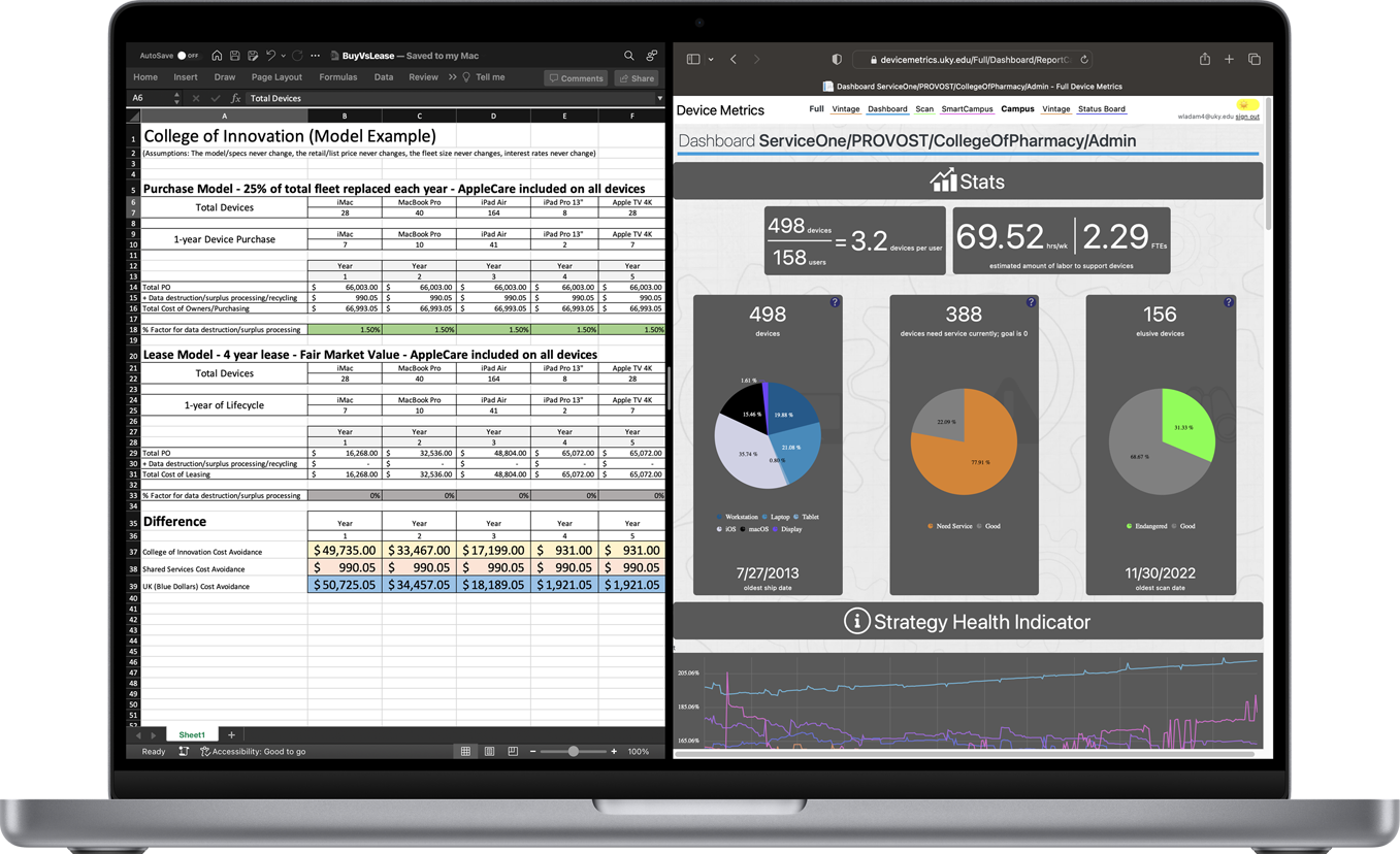 MacBook Pro. Từ xử lý số liệu đến minh họa hình ảnh, hiệu năng của máy Mac hỗ trợ đắc lực công việc phân tích của Adams. Tính năng Split View hiển thị dữ liệu trong Excel gọn gàng bên cạnh dashboard thông tin về hiệu quả công nghệ của Đại Học Kentucky.